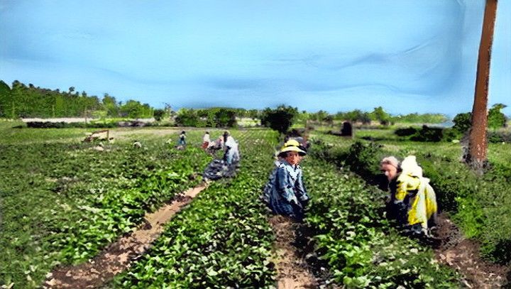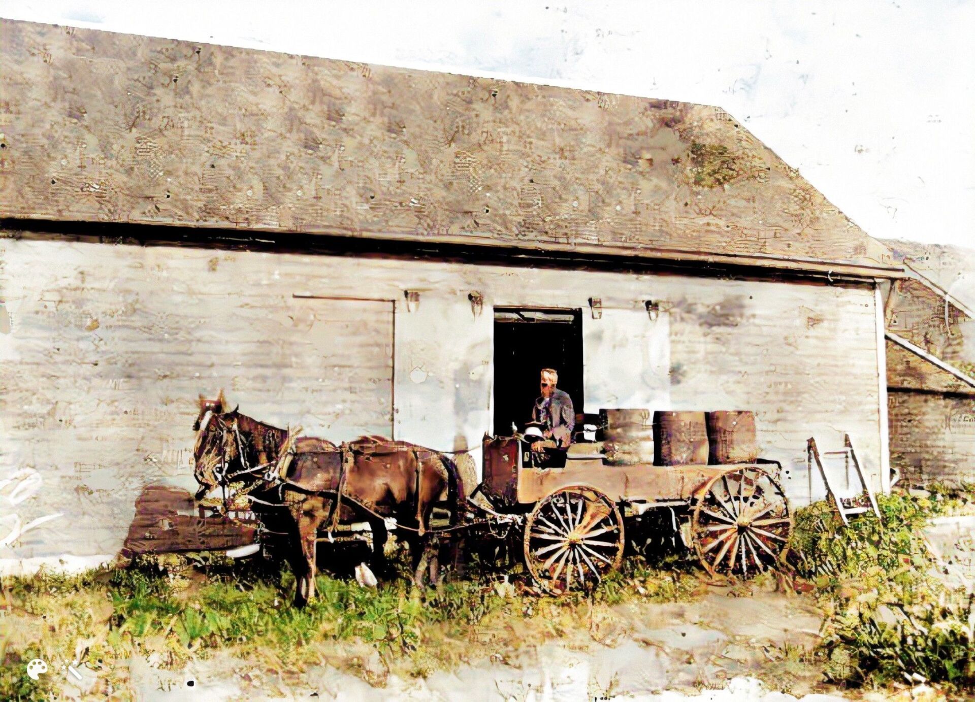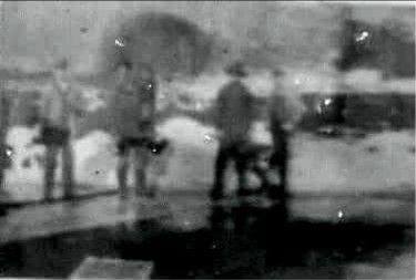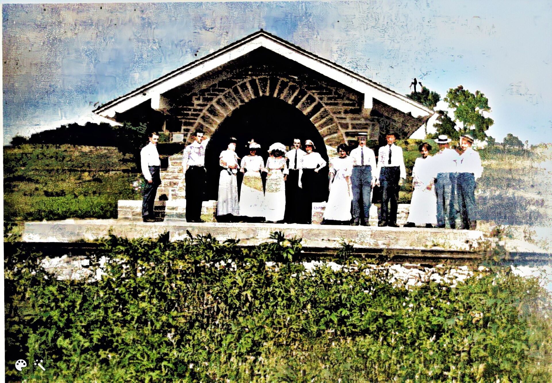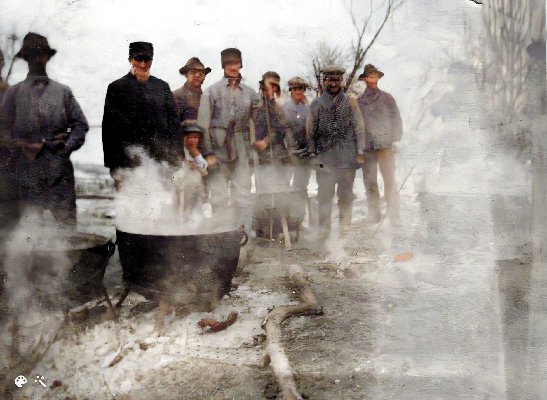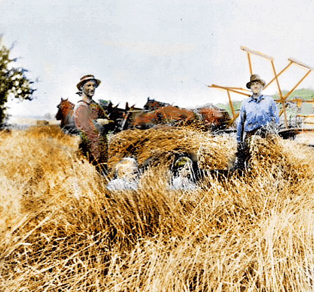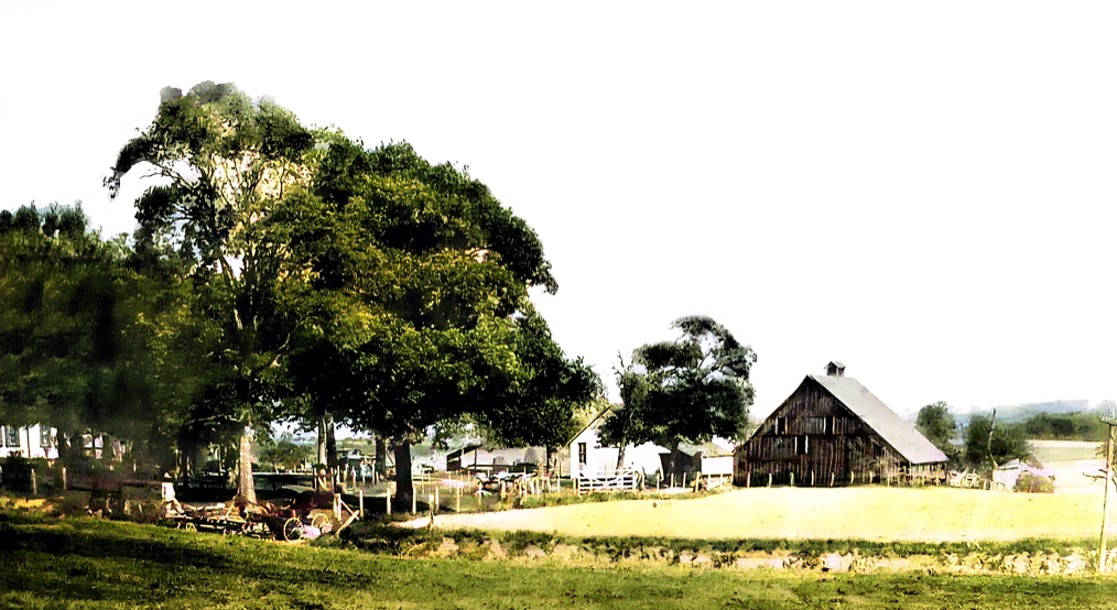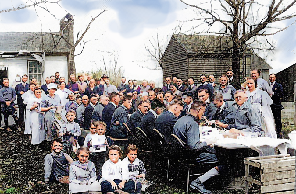 Back of photo says, "Hog milling on Brenner Ridge". Second man from left is thought to be John Peter Brenner and this may have been on his farm which was across the street from today's roller skating rink on NW Gateway. Circa 1915 (colorized)
