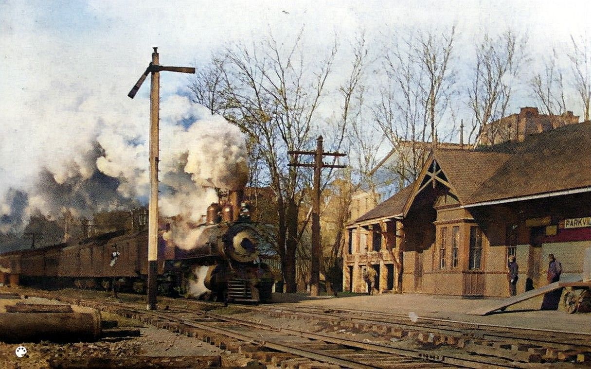 Locomotive passing Parkville's station.