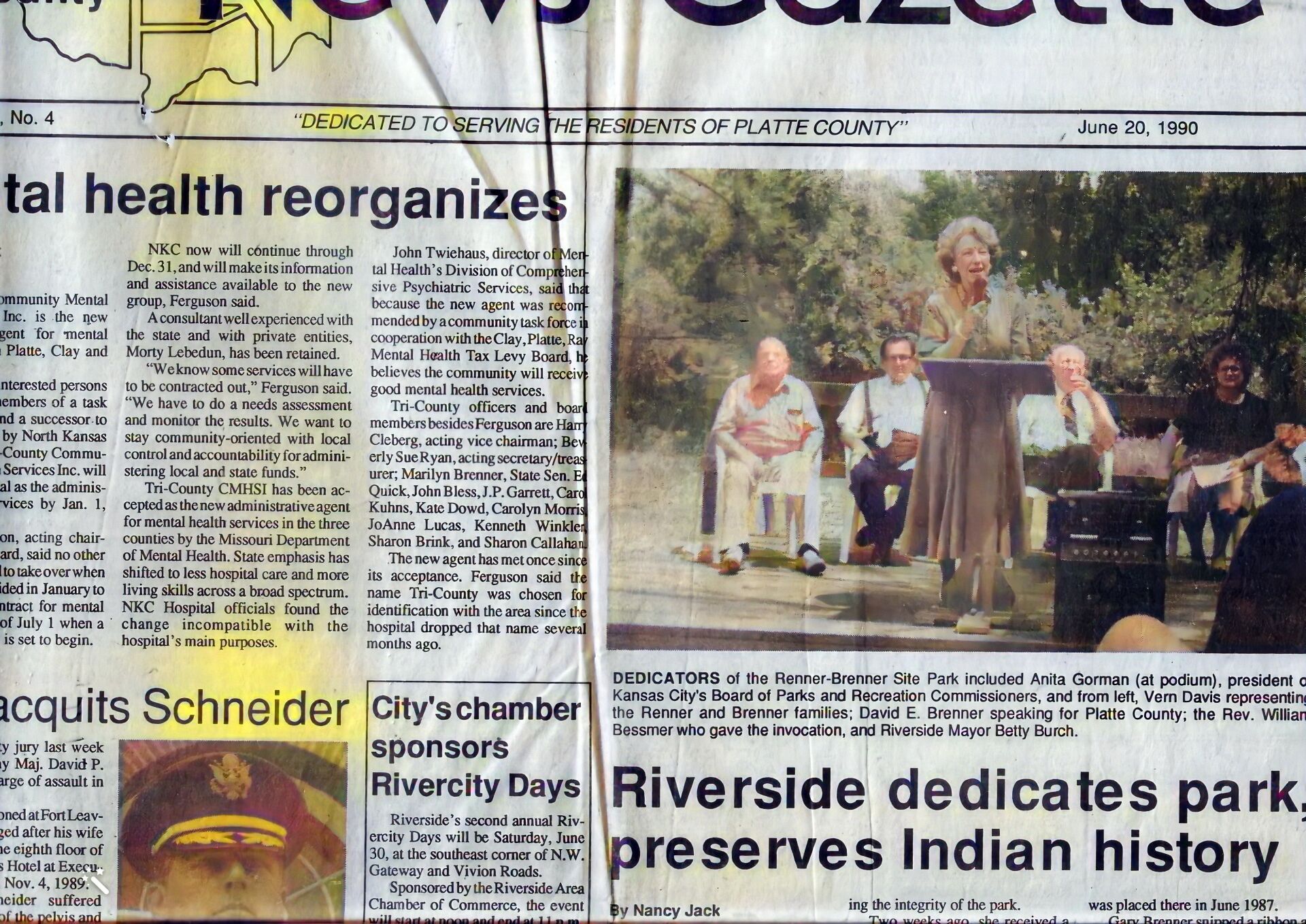Carolina Brenner Renner passed away in 1979 and lived in the white house south of the current Renner Park- which at that time was a corn field. Gary Brenner and his then wife, Mary, moved in to rent the home until it could be sold by the estate. Gary ran for city council with the goal in mind to have the city buy the land and make it a park. They were able to only buy a small part of it. In 1982, Gary won and at 2 AM during a long council session he proposed the city buy the remaining land and the vote was obvious in his favor. Between 1982 and 1984, Gary served on the council and the park board. He was teaching archaeology for Maple Woods and running his father's apartment business. He wrote three published papers on his archaeology work and somehow found spare time to direct the city in developing the park.