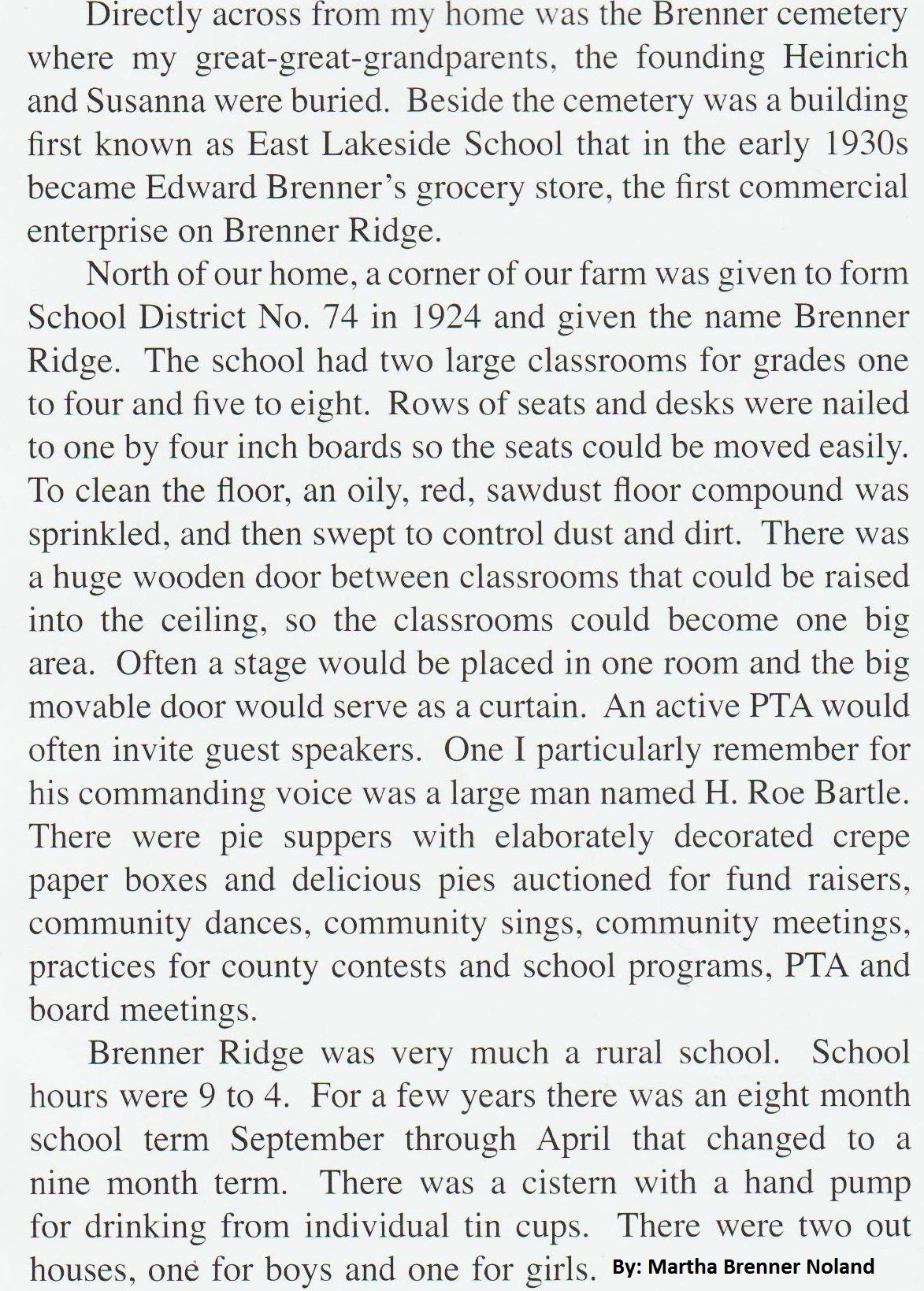Carolina Brenner Renner) and would die in her home in August 1929. Carolina's home is the old white house that is on the south side of the Renner-Brenner Site Park. Lousia passed in 1933. The are both buried in the cemetery that bears their name on the west side of Gateway southwest of the Eagle Animal Hospital. When John moved in with Carolina and her husband Leslie, she had a special room for her dad where she had an electric door bell by his bed to summon her when he needed help. My first wife, Mary Brenner Smith and I bought the home in 1980 and that room still had the door bell in it. It was years later before I learned the history of the door bell button on the wall.