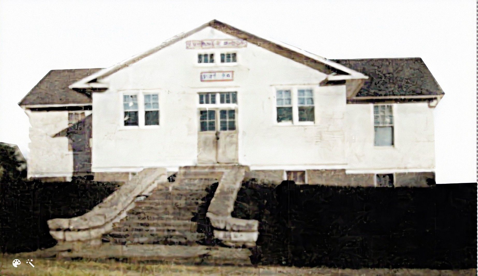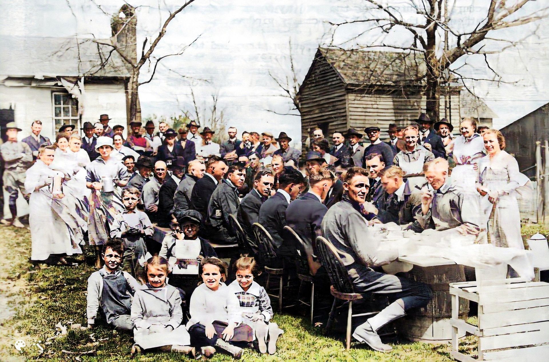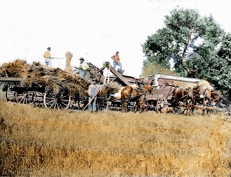Back of photo says, "Hog milling on Brenner Ridge". Second man from left is thought to be John Peter Brenner and this may have been on his farm which was across the street from today's roller skating rink on NW Gateway. Circa 1915 (colorized)