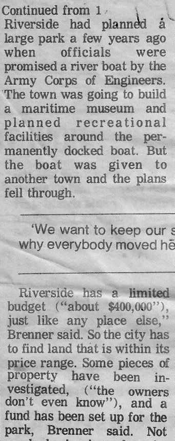 came along. The thought of the dream did come true. The "extra" money in the city budget of about 1.5 million then, was $400K. Today, (2018) you can probably multiply the 1.5 million at least 20 times. In the article, Brenner reports a "fund" had been set up for a park (by the River). Mr. Young