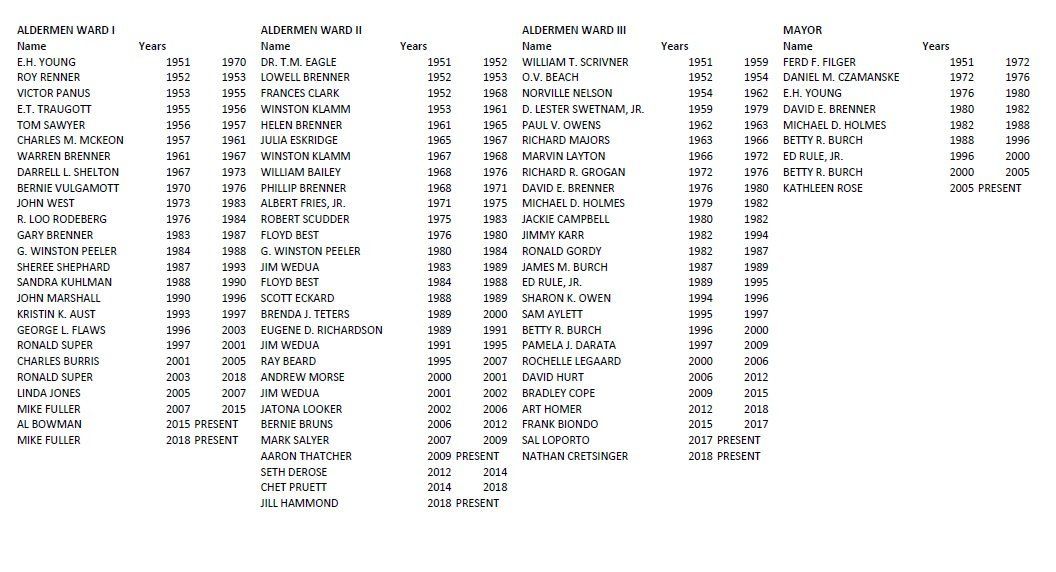 Young, Panus and Filger scheduled a meeting with Platte County Presiding Judge, A.J. Hillix to determine what procedures were to be followed in appointing a mayor and board before an election could be called the following April. On June 21, 1951, the Platte County Court was presented a Petition for Incorporation. (Presiding Judge/Commissioner was A. J. Hillix, George Offutt was Eastern Judge and O. W. Thompson was Western Judge. Holman Ham was the County Clerk). On June 26, the court issued an order declaring the City of Riverside a Body Corporate, Fourth Class City and appointed First Officers of the newly formed city. Ferd F. Filger was appointed mayor of Riverside by the Platte County Court. He and other city officials served until the first regular city election in April 1952. Aldermen included E.H. Young, Roy Renner, Dr. Thomas Eagle and Will Scrivner. John Scott served as marshal, Lowell Brenner as collector and Mrs. Curtis (Helen) Brenner, city clerk. Boundaries for this new city were generally north from the Missouri River, east to Highway 169 and north to Northmoor. A census by Dr. Eagle showed 750 persons living in the area. The petition for incorporation was signed by 400. Businesses in the area included the Riverside Stadium and a motor car racetrack in the vicinity of the former Riverside Jockey Club. Riverside's first city election was held in 1952. Mr. Filger was then elected Mayor. The elected aldermen were E.H. Young, Mrs. Francis Clark, William Scrivner, O.V. Beach, Roy Renner and Lowell Brenner.