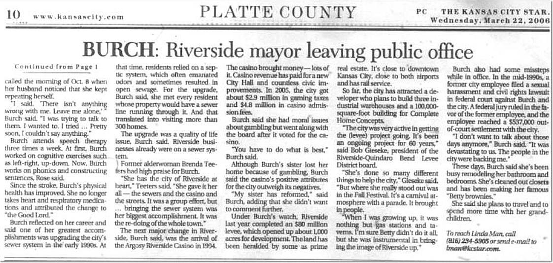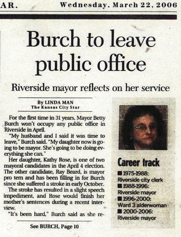 She married Mitchell B. Burch, on February 10, 1950 and their reception was held at the Green Hill's Club. Betty began her 31 year career with the city in 1975. She served as city clerk from 1975 to 1988 and then mayor from 1988 to 1996. From 1996 to 2000, she served as Alderman and Mayor again from 2000 to 2006.