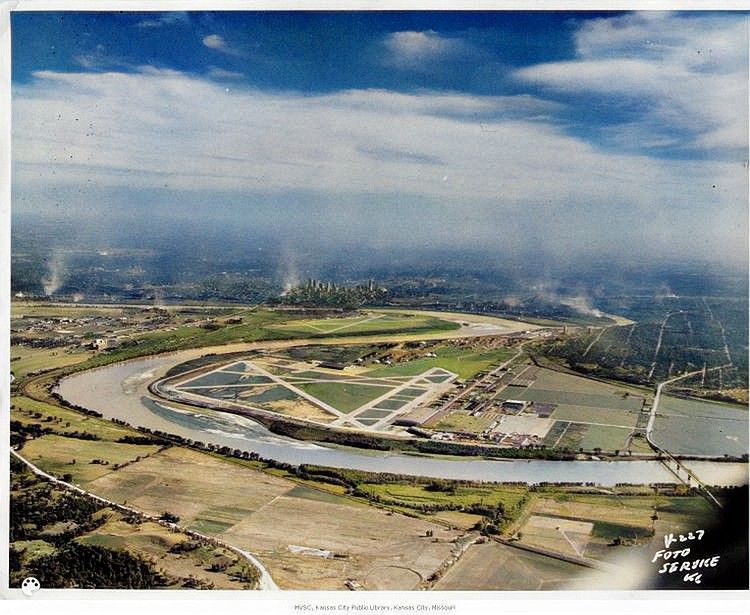 Looking northerly from downtown KC towards Riverside. The Riverside Park horse track is still visible. Fairfax airport wasn't built yet.